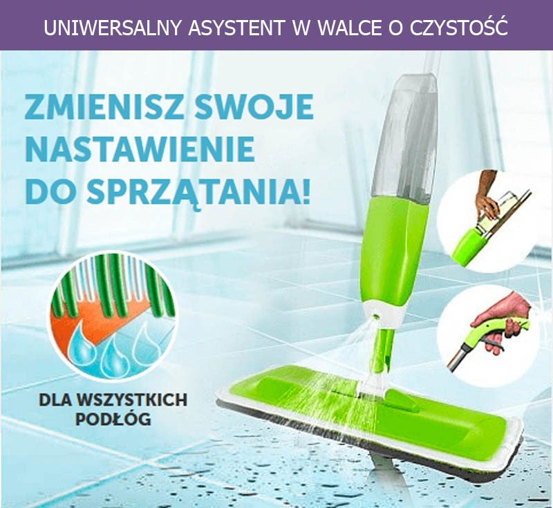 Mop z rozpylaczem to naprawdę bardzo „inteligentna“ rzecz. Ścierka z mikrofibry doskonale wchłania płyn. Wszelkie plamy zostaną umyte nie zależnie od tego czy to kawa, kurz, ślady jedzenia, czy buty. Kilka ruchów i Podłoga błyszczy. Ważne jest również to, że za pomocą mopa 3 w 1 można czyścić nie tylko parkiet, laminat i drewno, ale także granit i płytki.